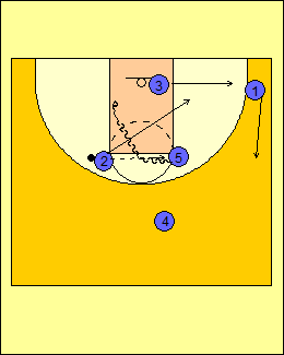 Backdoor Calls - "Drop 23" We would repeat the same action at the end of the play as in Drop 2 or Drop 3. If #3 does not get the backdoor pass he will continue his cut to the corner while #1 slides up to the wing. #2 hits #5 and runs a blur screen to the opposite low block area while #5 drives off the back of #2 on the cleared out side of the floor for the power lay-up. |