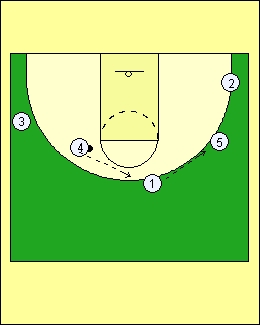 4 Kansas Half Court Offense (#4) reverses the ball to (#1) who passes to (#5). |