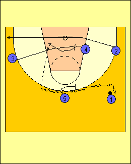 If #4 is not open, #5 continues his movement after ball screening for #1 and sets a down screen for #3 in the lane. #1 looks to hit #3 for the open jumper on top. |