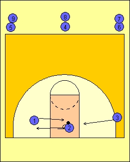 Lay-up (con't) #1 gets the rebound and #3 has started his cut back towards the basket. #2 sprints out to the left corner. |