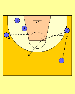 After #1 penetrated in the gap, #2 would start his movement in the lane and then to the top of the key area. This movement on the back side of the floor from #2 is a must, if not only for transition defensive purposes. #1 drove, passed the ball, and then cut out to the opposite wing area. |